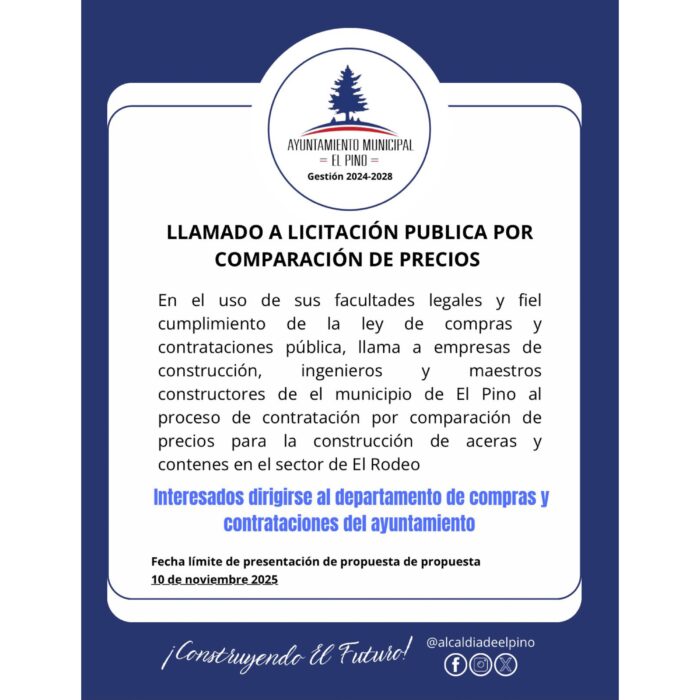 Llamado a Licitación Pública por comparación de precios, interesados dirigirse al Departamento de Compras y Contrataciones del Ayuntamiento Municipal.